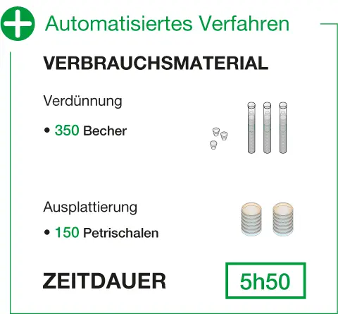 Mit easySpiral Dilute können Sie 50% Ihres Verbrauchsmaterials und 50% Ihrer Arbeitszeit einsparen. 134 Sek. für die Ausplattierung (1 Desinfektion + 5 Verdünnungen + 1 Ausplattierung einer Verdünnung)
