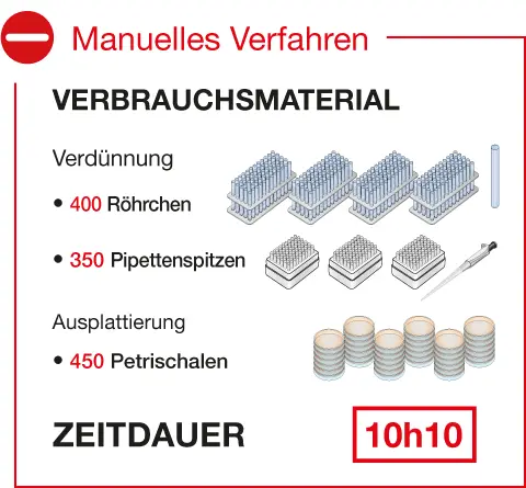 Manuelle Ausplattierung erfordert wiederkehrende Abläufe : hier sind 4 Verdünnungsschritte und 4 Petrischalen notwendig, um eine auszählbare Petrischale zu erhalten.