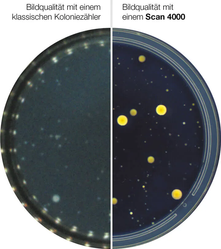 Die Zählung von Petrischalen ist langwierig, aufwendig und kann von Person zu Person variieren. Der Scan 4000 kann in einer Sekunde bis zu 1000 Kolonien in einem konstanten und wiederholbaren Modus zählen. Die Genauigkeit der Auszählung kann bis zu 98 % betragen. Die Mindestkoloniegröße beträgt 0,05 mm.