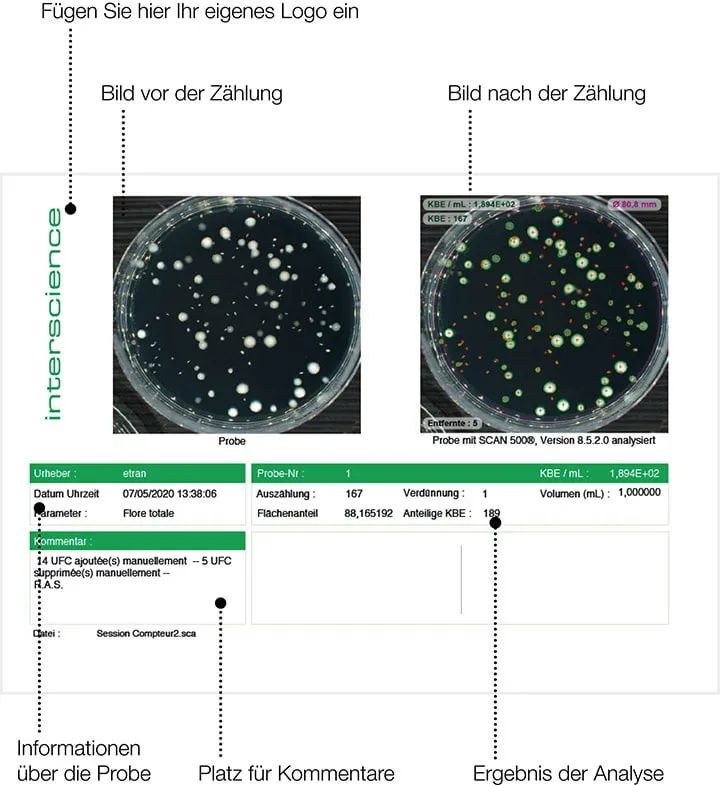 Üblicherweise werden die Petrischalen nach der Auszählung entsorgt, bei Reklamation ist eine nachträgliche Überprüfung nicht möglich. Bei Scan 4000 werden alle Berichte archiviert.