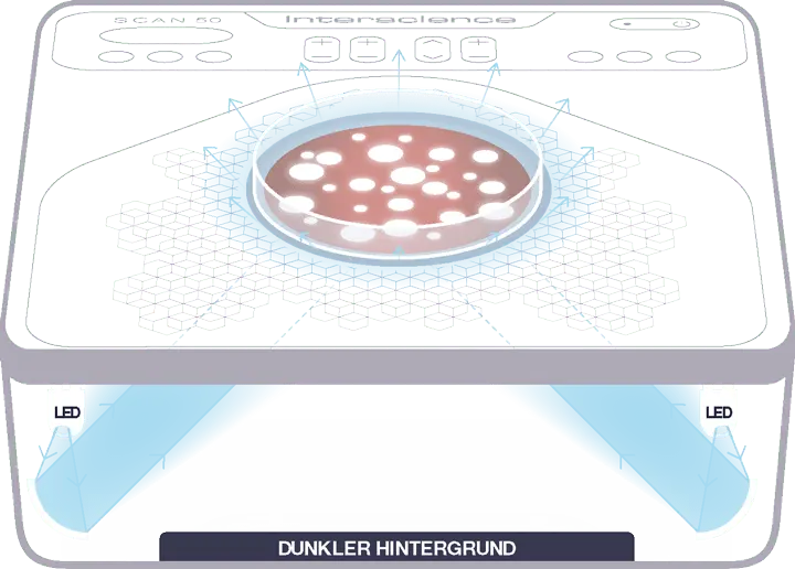 Dark Field 2 ist ein indirektes Beleuchtungssystem mit einstellbarer Intensität. Lichtreflektoren streuen das Licht an allen Punkten ohne Reflexionen oder Schatten. Es hebt alle Kolonien auf der Oberfläche, in der Masse und am Rand der Schale hervor. Lichtblitze werden vermieden und die Augen des Bedieners werden geschützt.