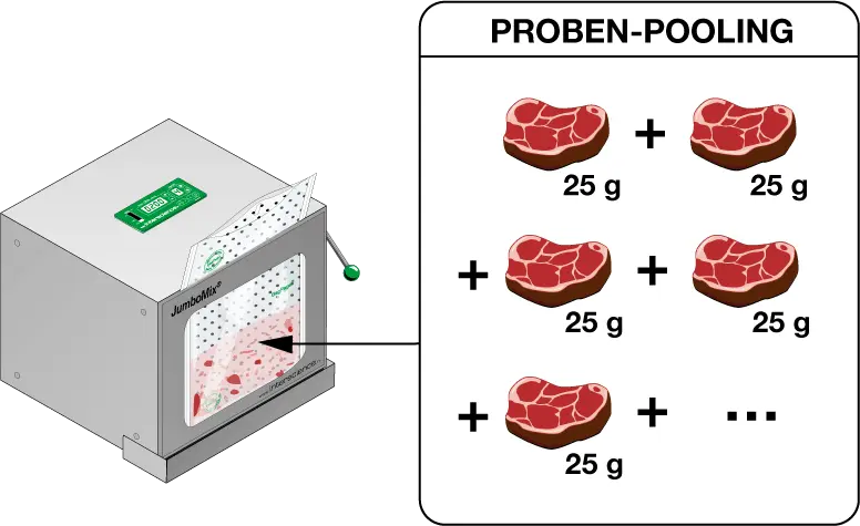 JumboMix W CC ist ideal für das Proben-Pooling. Die große Kapazität der Mischkammer ermöglicht eine Probensammlung bis zu 375 g für eine bessere analytische Empfindlichkeit. Zum Beispiel: 5 Proben à 25 g, 1 : 10 in einem Beutel verdünnt.