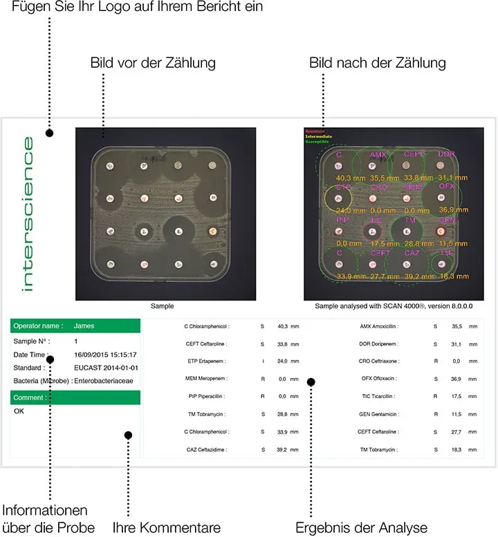 Üblicherweise werden die Petrischalen nach der Auszählung entsorgt, bei Reklamation ist eine nachträgliche Überprüfung nicht möglich. Bei Scan 4000 werden alle Berichte archiviert.