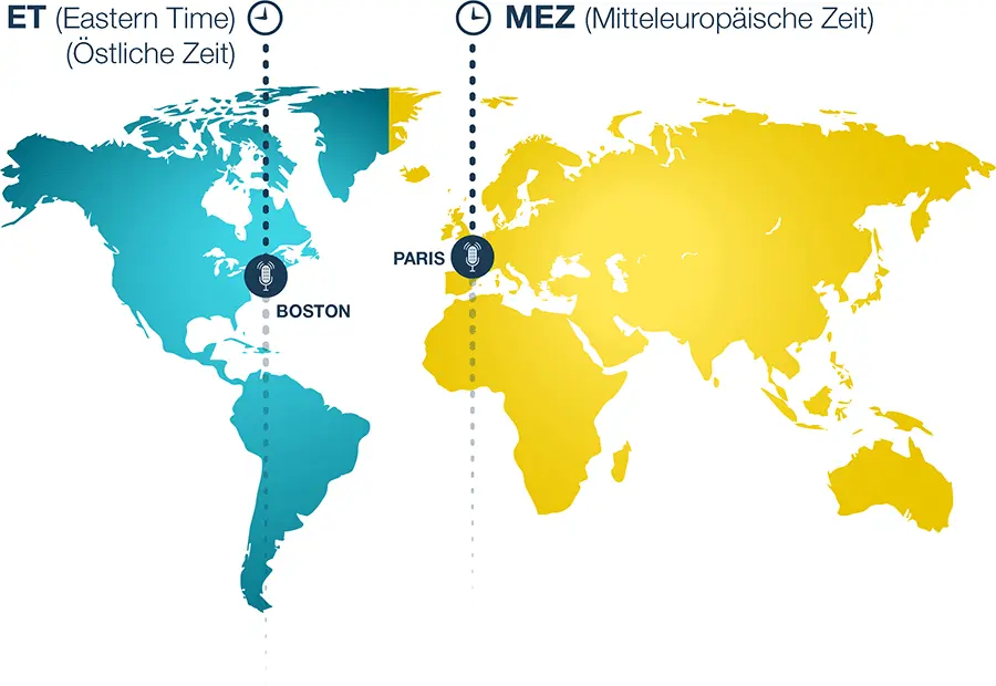 Unsere Webinare werden sowohl auf Englisch als auch auf Französich angeboten. Sie können dank der Verteilung auf drei Zeitzonen auch Ihrer geographischen Lage angepasst werden: MEZ (Mitteleuropäische Zeit)), ET (Eastern Time - Östliche Zeit). Jedes Webinar dauert etwa 30 Minuten, ein Zeitfenster, dass es Ihnen leichter ermöglicht teilzunehmen.