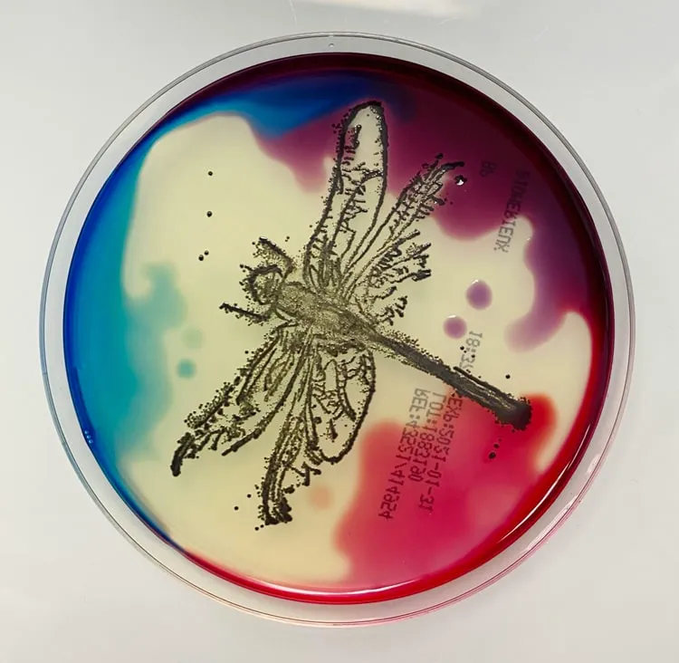 Für diese Zeichnung habe ich das Kligler-Medium verwendet (am Anfang rot), weil sich die von mir gewählten Farben nur auf diesem Medium entwickeln. Ich habe die Keime mit Hilfe von Zahnstochern ausgesät, um die Zeichnung genauer zu machen.
