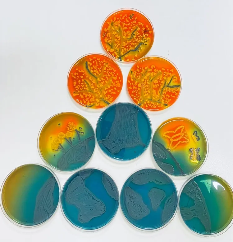 Um diese Farben zu erhalten, musste ich zwei Inkubationen durchführen. Die erste erfolgte bei 30 °C für 24 Stunden, um die Entwicklung von Serratia zu fördern, und die zweite unter anaeroben Bedingungen bei 37 °C für 24 Stunden, damit der Citrobacter H2S produziert.