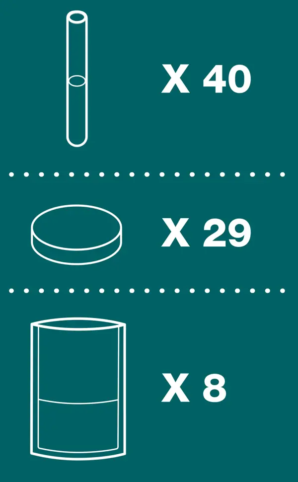 - Verteilung von Flüssigkeiten: Röhrchen zur Verdünnung, Flaschen, Gläser, Flaschen, Filterbeutel, Probenbeutel