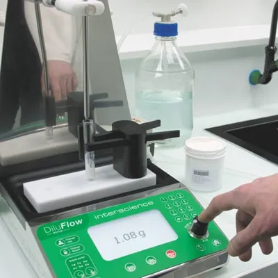 Weigh the sample with the dilutor. The DiluFlow Elite 1 kg dilutor automatically dispenses the diluent according to the chosen dilution factor with ± 2 % accuracy in accordance with the standards.