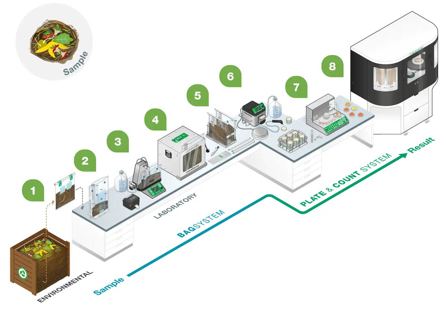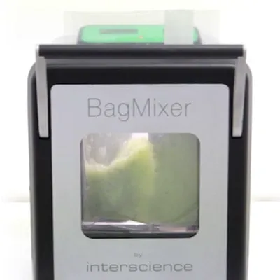 The sample is homogenised in a JumboMix W CC without any contact with the mixer, thus avoiding cross-contamination. Bacteria are quickly removed from the sample without being destroyed and the filter in the bag removes particles in the filtrate.