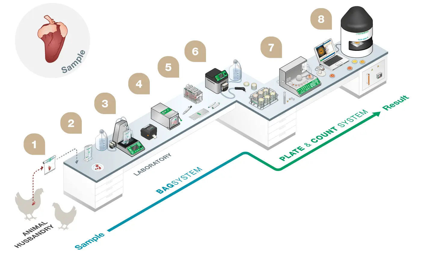 The sample is homogenised in a MiniMix without any contact with the blender, thus avoiding cross-contamination. Bacteria are quickly extracted from the sample without being destroyed and the filter in the bag removes particles in the filtrate.