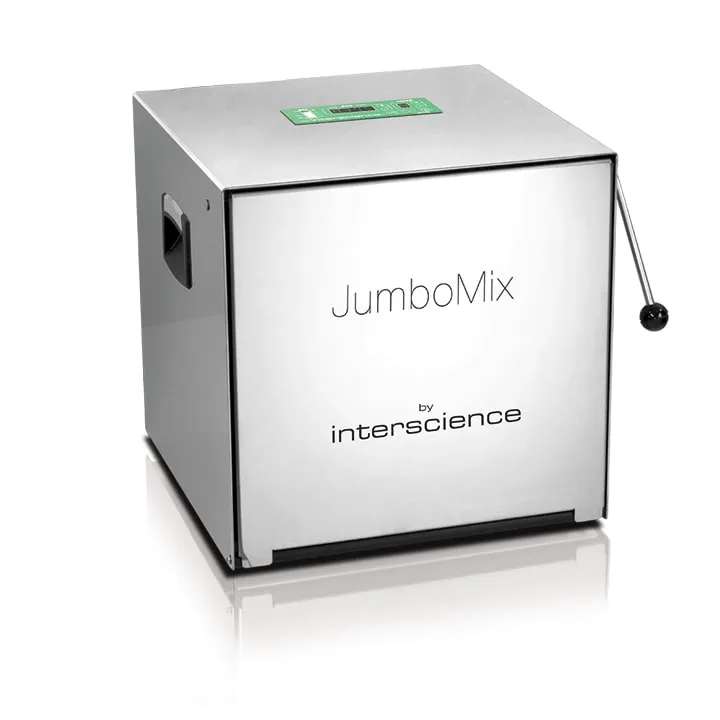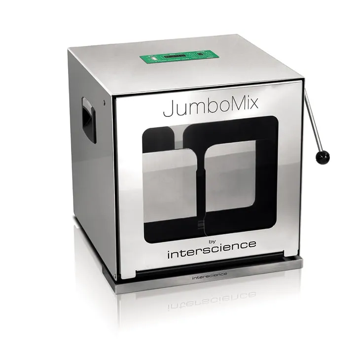 Suitable for any volume between 200 mL to 3750 mL, JumboMix blends all types of samples up to 375 g in 30 to 60 seconds. The removable paddles allow a complete and efficient cleaning and disinfection process.
