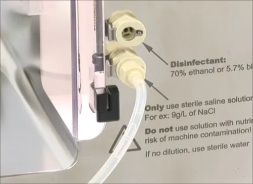 Overflow technology cleaning system and stylus disinfection. A light is activated in case of empty disinfecting liquid.