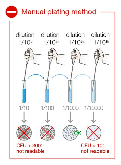 Manual plating method requires repetitive actions: at least 4 dilutions and 4 successive platings are necessary to obtain one good and readable Petri dish.