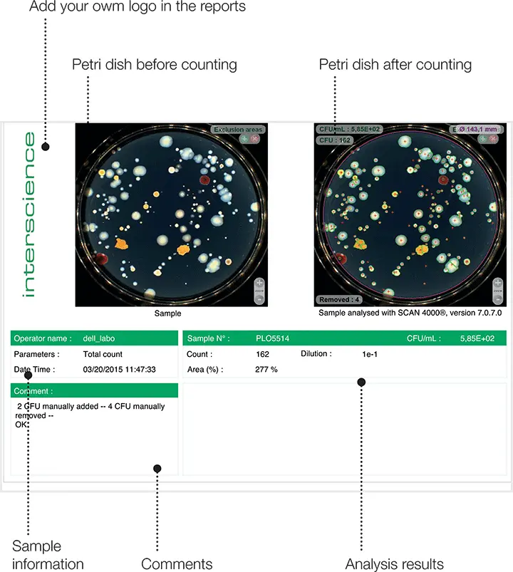 Scan 4000 offers multiple export possibilities to save manual input time. It also increases the security and quality of your analyses. Usually, Petri dishes are thrown away after counting and no further verification is possible in the event of a claim. With Scan 4000, all reports are archived.