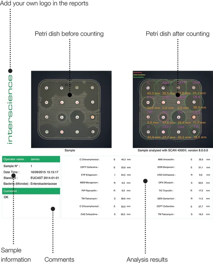 Scan 4000 automatically detects the peni-cylinders, present or removed, made of steel or plastic. It also reads agar wells or paper disks (any brand). Add/remove disks manually.The inhibition zones can also be resized. Scan 4000 allows reading on blood, chocolate or Mueller Hinton agar. In its automatic colony counter mode, Scan 4000 counts colonies on round or square Petri dishes.