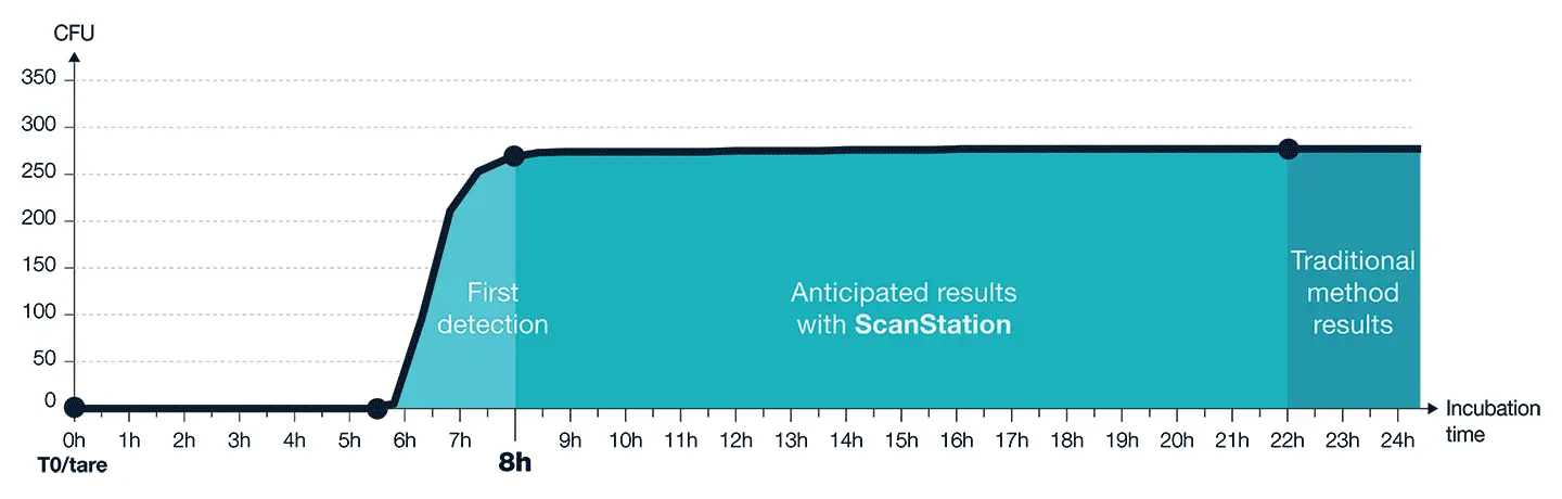 With ScanStation technology, monitor bacterial growth in your analyses in real time. Colonies are detected and counted as soon as they appear, significantly reducing the time needed to obtain results - up to three times faster than the traditional method.