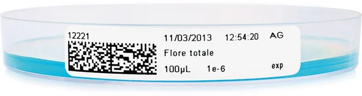 Controlled by dataLink pro, semi-automated labeling on the edge of the plate facilitates identification of Petri dishes for the microbiological analysis chain, and is particularly well suited to large-scale production runs.