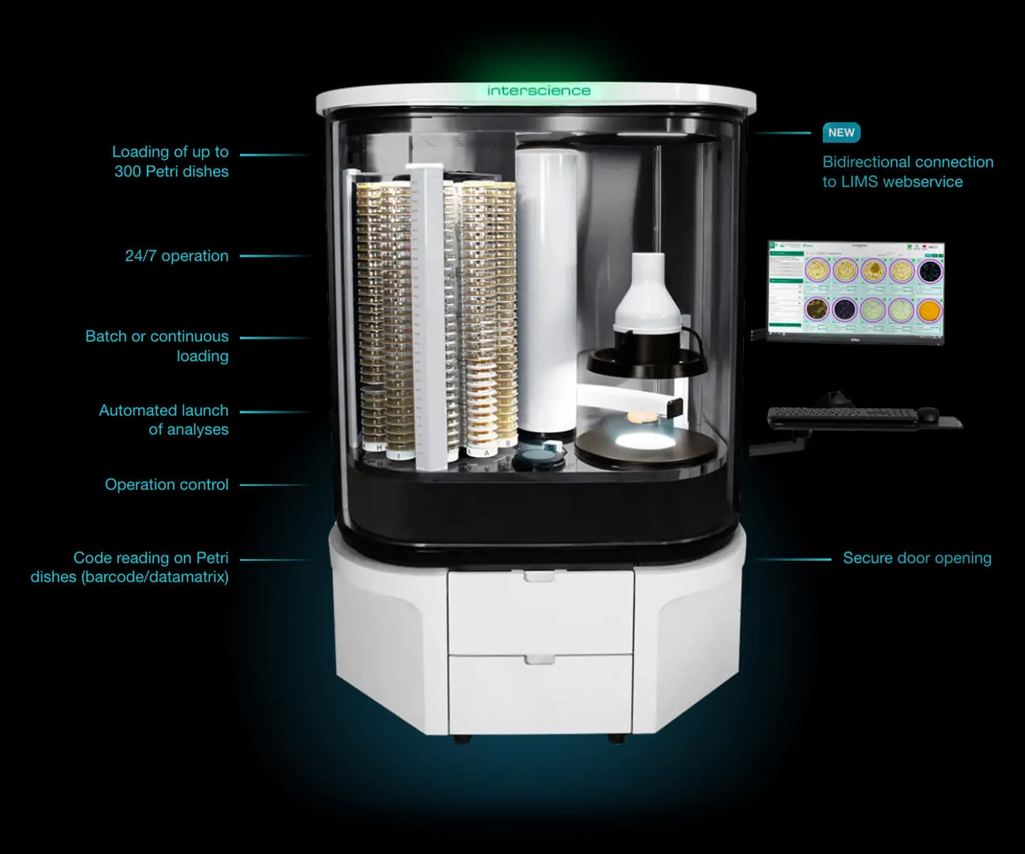 ScanStation’s integrated reader identifies the code on the Petri dishes’ label, enabling personalized tracking of each plate in the carousel. Information is transmitted to the LIMS via a bidirectional connection.