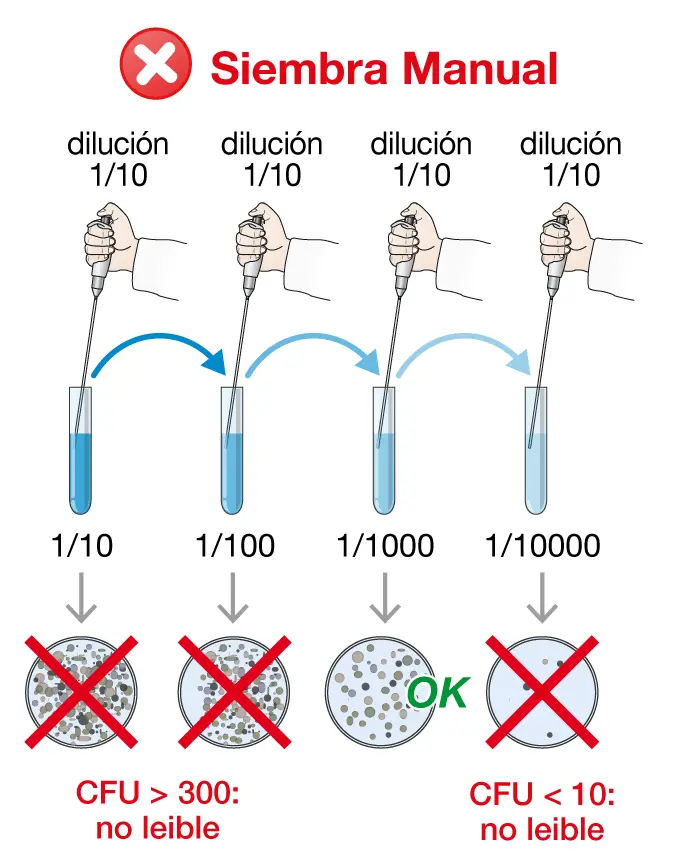 En el método de referencia, se realizan cuatro diluciones sucesivas y se siembra la 4ª dilución para obtener una placa interpretable. La técnica de la espiral permite aquí sembrar directamente la solución madre.