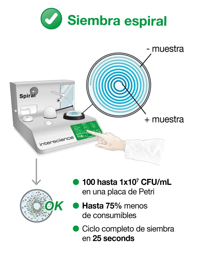 La técnica en espiral es un modo de siembra superficial. Es similar a los métodos horizontales utilizados habitualmente en los laboratorios. En comparación con los métodos de referencia, las pruebas interlaboratorios como RAEMA muestran que no hay diferencias estadísticamente significativas entre ambos métodos.