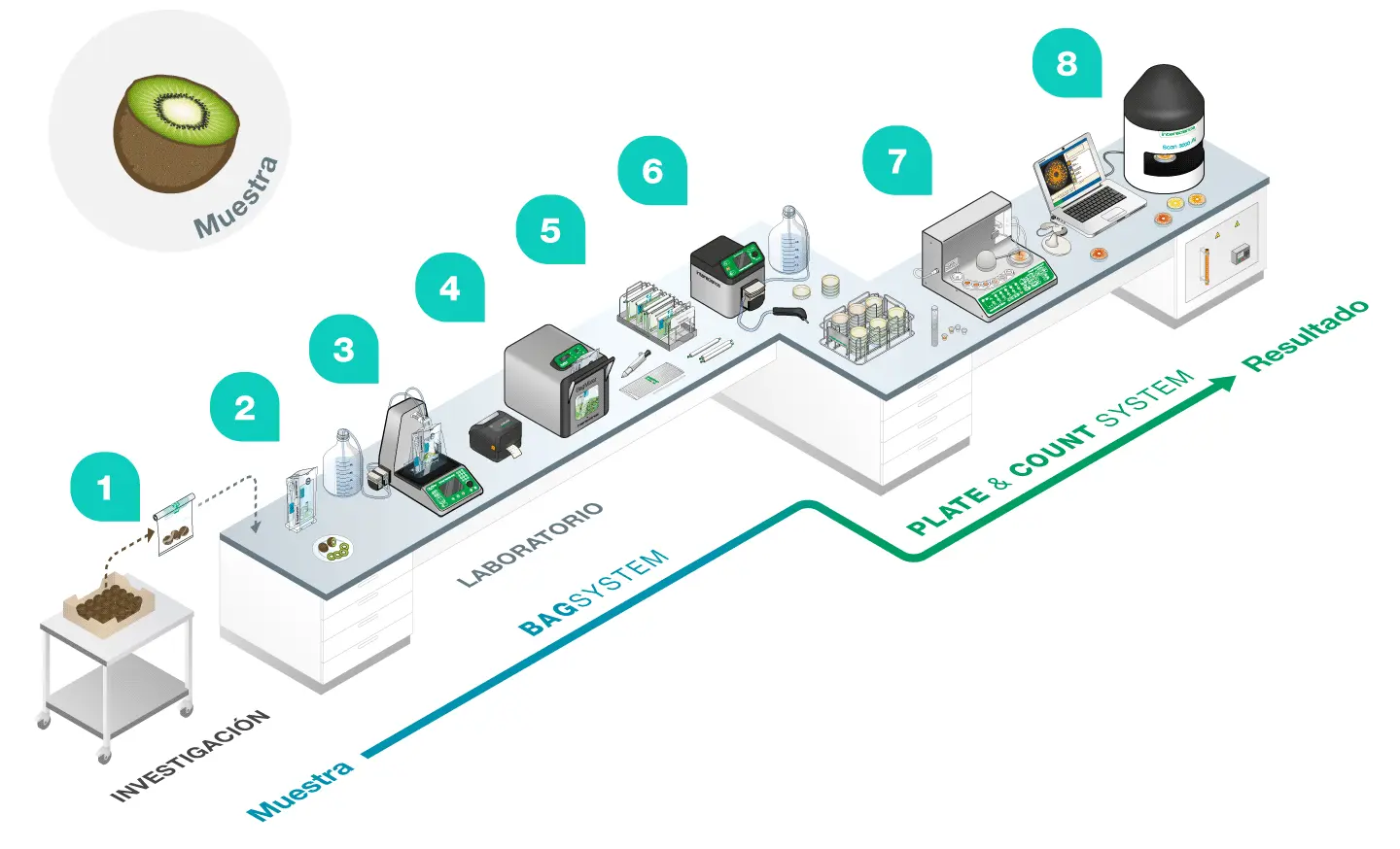 La muestra es homogenizada en el BagMixer SW sin contacto alguno con el mezclador evitando contaminación cruzada. Las bacterias son rápidamente extraídas de la muestra, y el filtro presente en la bolsa permite eliminar la partículas del filtrado.