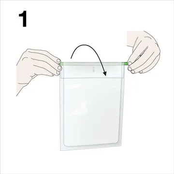 Pliegue la bolsa. Fije el Bag Clip. Coloque la bolsa en la gradilla BagRack.