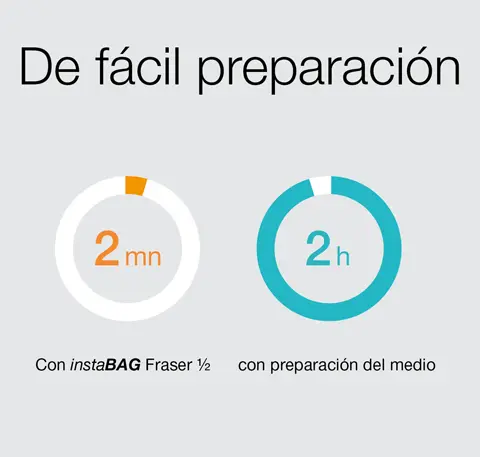 instaBAG es una bolsa con fitro lateral que integra un medio deshidratado y predosado (½ Fraser), permitiendo un proceso 2 en 1. Sáltese la larga preparación del medio de cultivo.