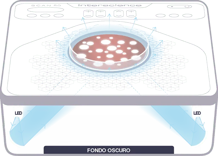 Dark Field 2 es un sistema de iluminación indirecta con una intensidad ajustable. Los reflectores luminosos difunden la luz sin reflejos ni sombras. El sistema hace con que todas las colonias se destaquen en la superficie, en profundidad y en los bordes de la placa. Se eliminan los destellos de luz y se protegen los ojos del operador.