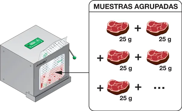 Por ejemplo : 5 muestras de 25 g diluidas al 1/10 en la misma bolsa.