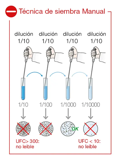 La técnica de siembra manual requiere acciones repetitivas: por lo menos 4 diluciones sucesivas y 4 siembras son necesarias para obtener una placa de Petri con lectura óptima.