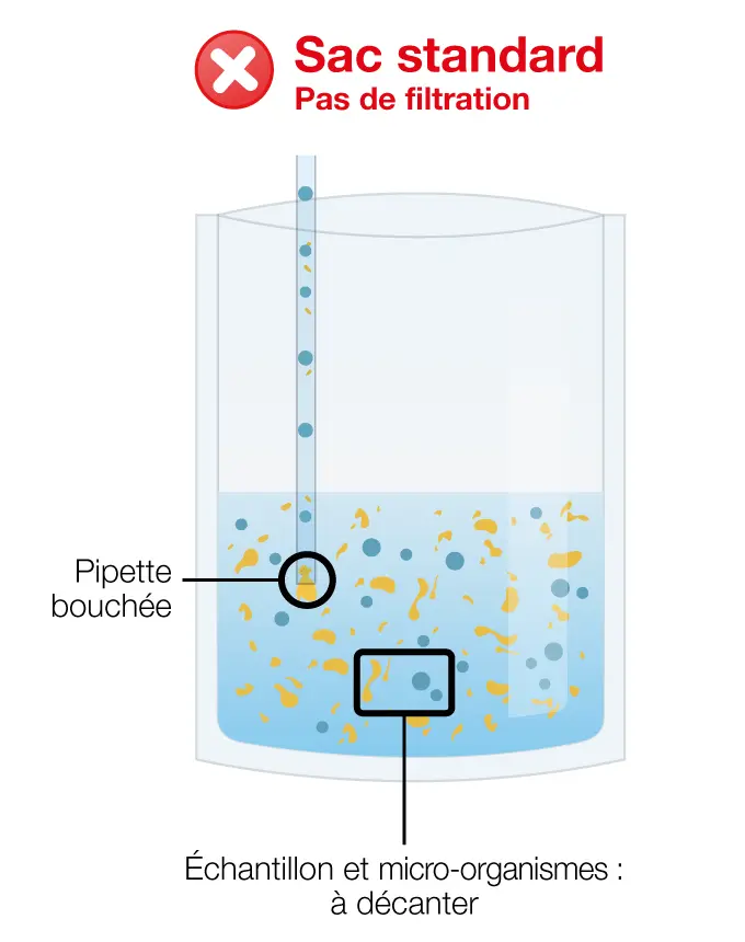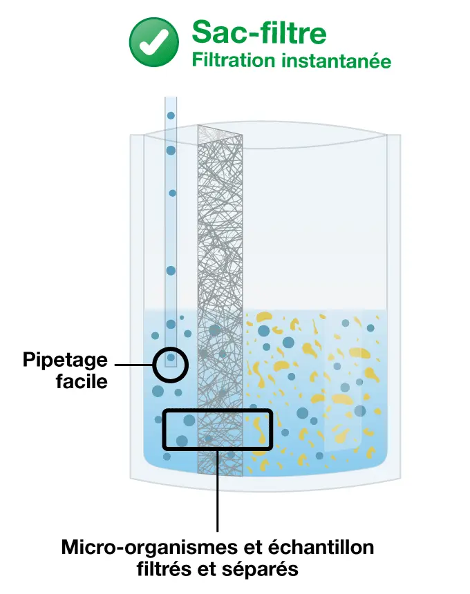 La filtration se fait pendant le malaxage. Il n’y a pas besoin d’attendre la sédimentation des débris pour pipeter.