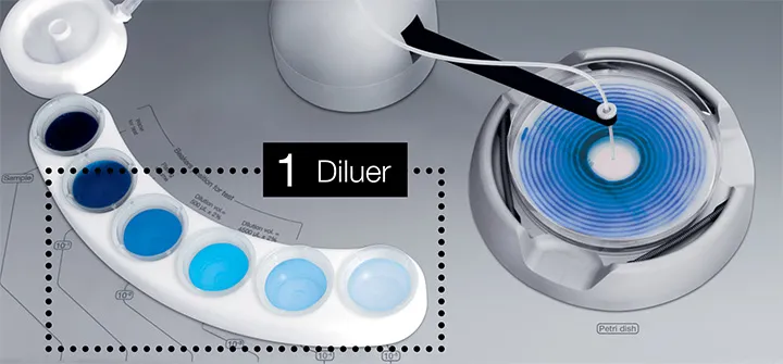 Placez votre échantillon dans un godet et choisissez votre facteur de dilution : de 10-1 à 10-5