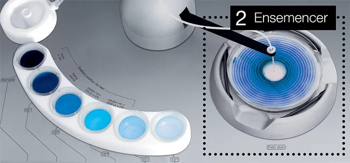 easySpiral Dilute dépose 1 goutte dans le fond d’une boite de Petri vierge. L’utilisateur doit ensuite ajouter de la gélose et la mélanger à l’échantillon.