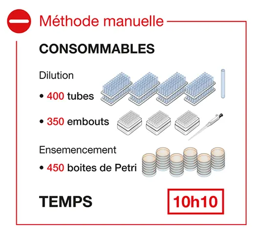 L’ensemencement manuel est une méthode aux actions répétitives : au moins 4 dilutions et 4 ensemencements successifs pour n’obtenir qu’1 boite de Petri exploitable.