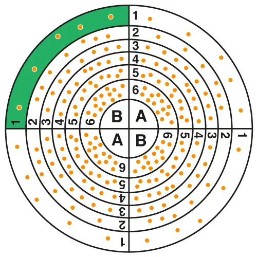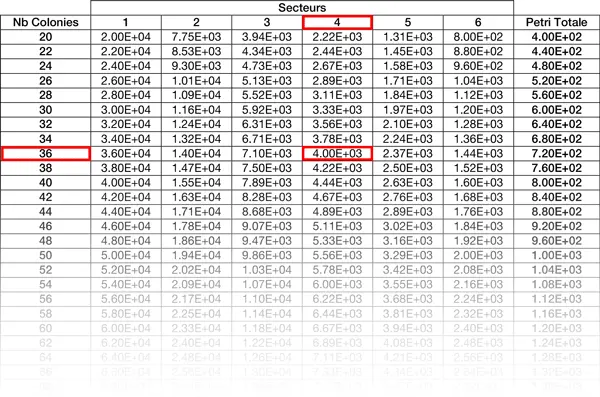 セクター1(最も希薄なセクター)から20コロニーを数え、少なくとも20コロニーに達するまで数え続け、このセクターですべてのコロニーを数え終わります。