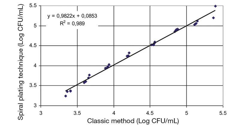 結論: 結果は、easySpiral によるスパイラル法での塗抹と従来法との間に強い相関関係 (R2 = 0.989) を示しています。 また、2 つの方法間の log CFU/mL の対数差の平均は最大差異に比べて12倍小さく、したがって有意ではありません。