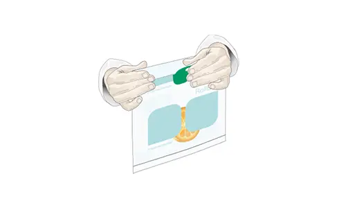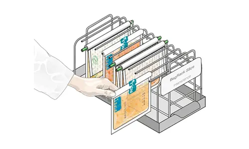 サンプルの入ったバッグは閉じられ、横からスライドされて BagRack Slide に収納されます。このようにして、バッグの保管は整頓され、衛生的、かつ効率的なピペティングのために最適化されます。それにより、作業関連性筋骨格障害(MSD)のリスクを予防します。