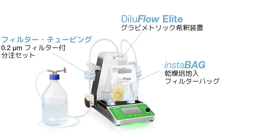 Steriwater は、DiluFlow Elite グラビメトリック希釈装置と instaBAG 乾燥培地入りバッグを使用して、滅菌水によるサンプル希釈を簡素化します。