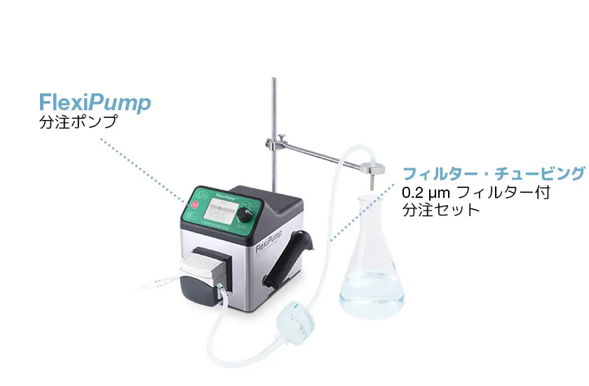 滅菌済フィルター チューブを接続し、FlexiPump (フレキシポンプ) 蠕動 ポンプに取り付けます。