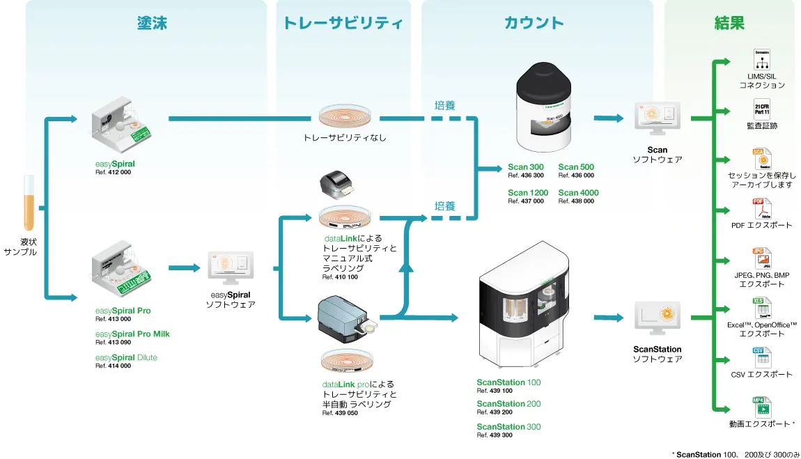 dataLink pro は、自動菌液塗抹装置 easySpiralと自動コロニー カウンターScan 又は ScanStationに接続され使われます。