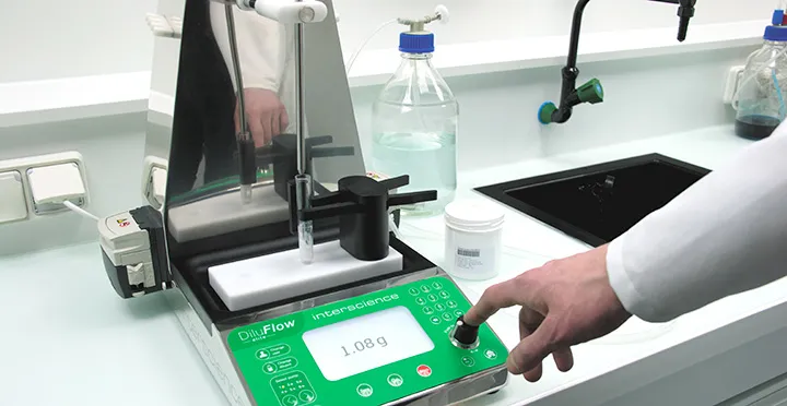 ダイリューフロー エリート 1kg は、最大秤量 1000g、数秒で固体サンプルに適切な重量の希釈液を分注します。医薬品、化粧品、獣医学の分野でのサンプル前処理に最適です。フル・トレーサビリティを備え、全てのオペレーションの記録が可能です。