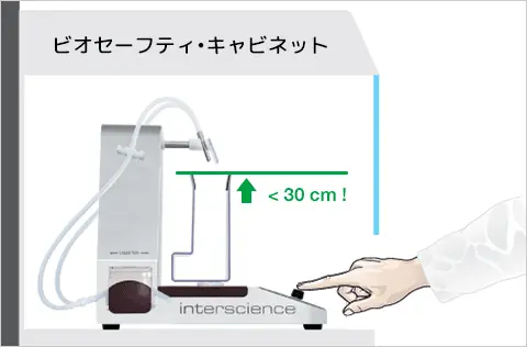 DiluFlow は、バッグオープニング設置の高さが世界で一 番低い 30cm 以下と非常に低く、特にバイオセーフティ・キャビネット内で使用の際、操作性が高まりより快適なラボワークを行うことができます。