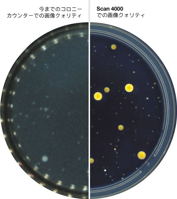 マニュアル式のシャーレのカウントは時間と労力を費やし、オペレーターによって結果にばらつきがでます。Scan 4000は、一秒に1000コロニーまでを一定で反復可能な方法でカウントします。最小0.05 mmのコロニーを検出し、精度は98%に達します。