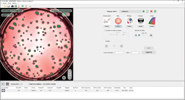 easySpiral と共に使用すると、全ての塗抹データは Scanコロニーカウンターに送られ、インキュベーション及びカウンティングパラメータは自動的に設定されます。