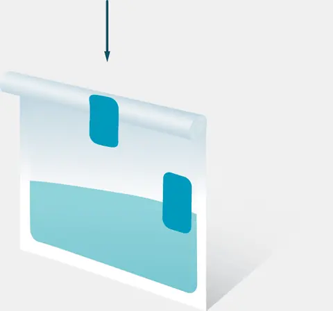 バッグ上方を3回丸く巻き、プレカットされた強力で防水性に優れた密閉シールでバッグを閉じます。