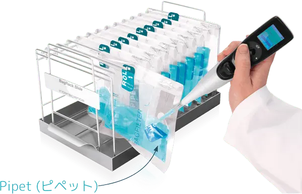 バッグ下部にピペット挿入口があることにより、特にラミナーフロー下での病原体研究に最適です。