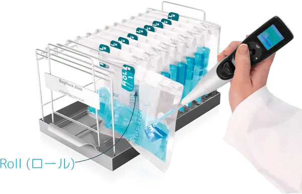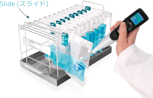 バッグラックスライドを使用し、バッグを横へスライドさせてください。サンプルの前処理から塗抹まで、使いやすいエルゴノミックなデザインで迅速に行えます。