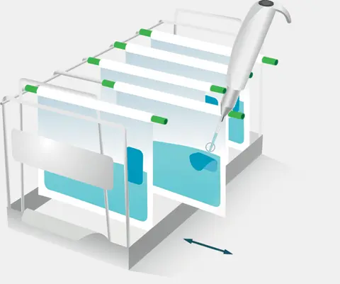 バッグフィルター ピペットとバッグラック スライドの併用でワークステーションが改善されます。R.S.I. (反復性過労障害)を防ぎ、ピペティングが効率化されます。